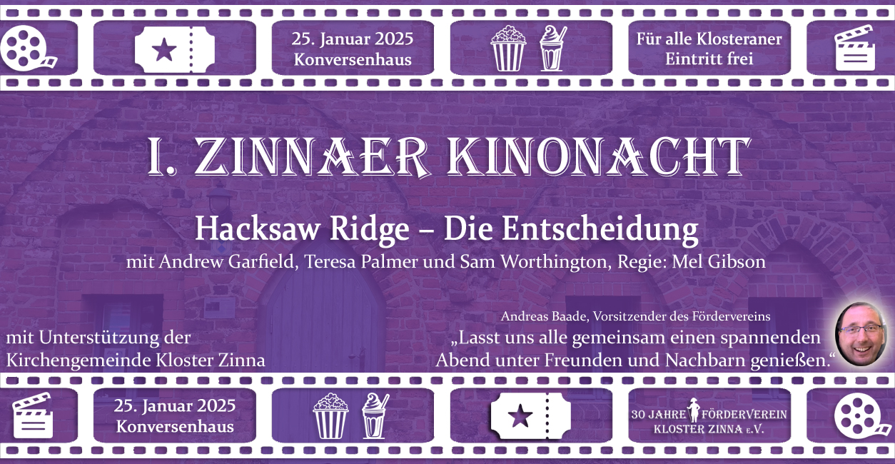 Künftig möchte der Förderverein Kloster Zinna mehrmals im Jahr in das Konversenhaus in Kloster Zinna laden, um gemeinsam einen Film zu schauen. Dabei soll die Auswahl des Filmes immer wieder einer anderen Gruppe übertragen werden, um für ein abwechslungsreiches Programm zu sorgen. Für den ersten Abend haben sich zwei Jugendliche aus dem Ort Gedanken gemacht und haben sich letztendlich für ‚Hacksaw Ridge‘ entschieden.